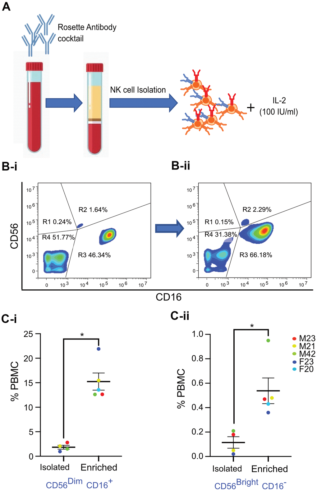 We use a cocktail of antibodies which is designed to precipitate cross link with RBC and precipitate all cells except NK cells in the co-culture. When we perform a density gradient centrifugation with PBMC, we can use histopaque over the blood and we spin it down, we can get PBMC. But if we pre-incubate the blood with this cocktail of antibodies, everything will precipitate and the only thing that would be in the interface would be NK cells.